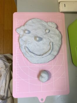First, we learned about body parts, particularly around the face, and together we made a cute face out of clay. Each of the kids had the chance to make a piece. After that, the dinosaur section of the lesson came, this time focused on dinosaur eggs.