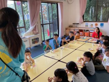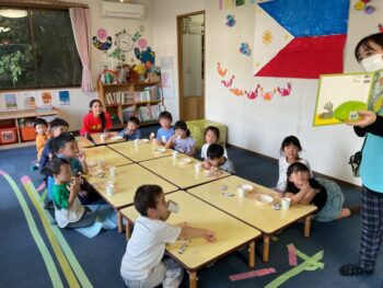We came back for the snack time. Before eating we practiced the weather, month and day of today. During snack time, we read a book.