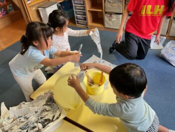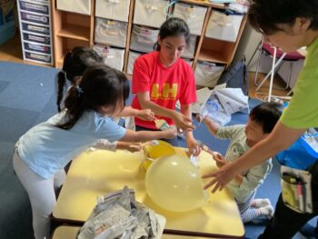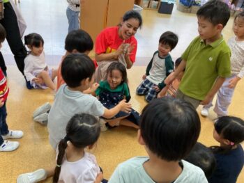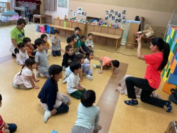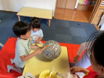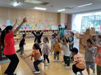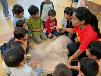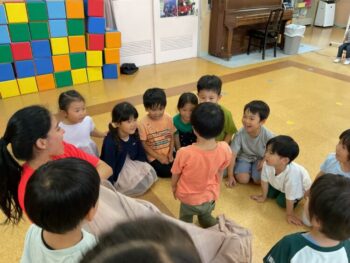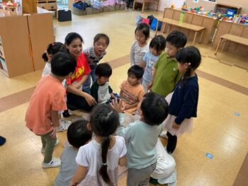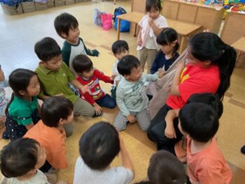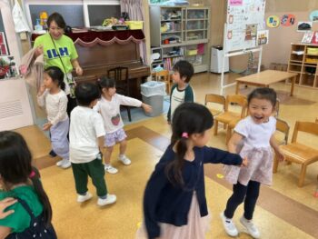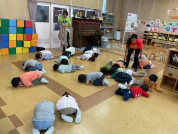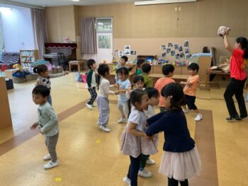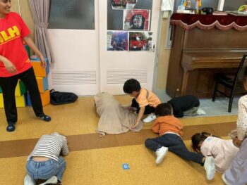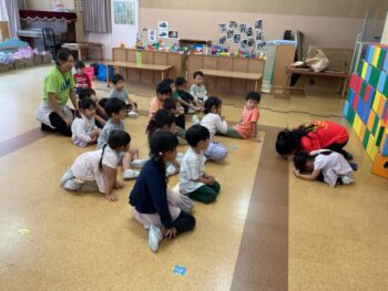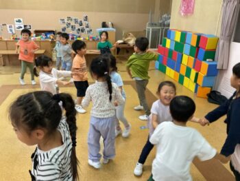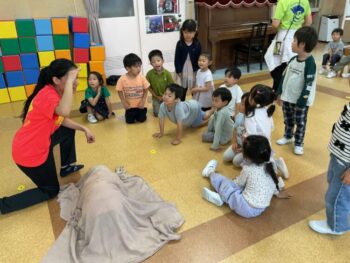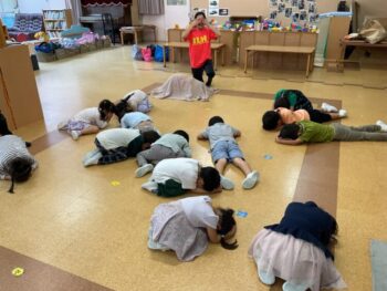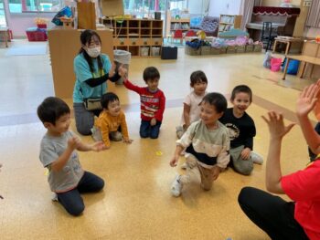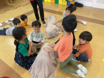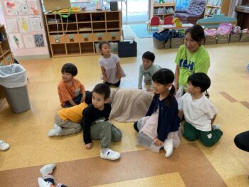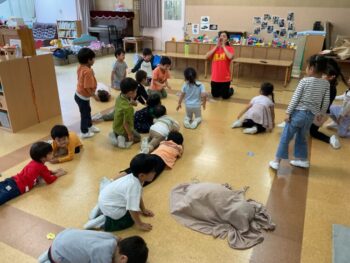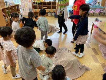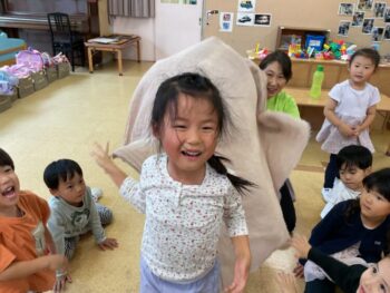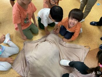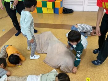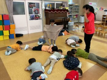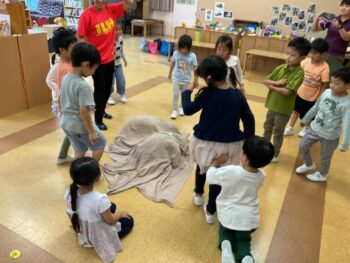 Today we played a very fun game together! The kids were dancing, and when the music stopped, they had to close their eyes and curl up while one of their friends was hidden under a blanket. The remaining kids then had to guess who was under the blanket and