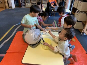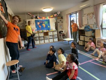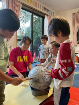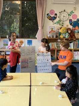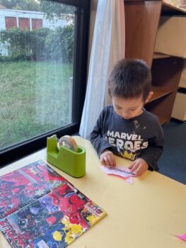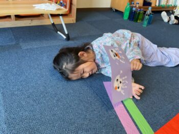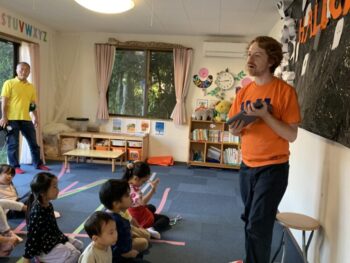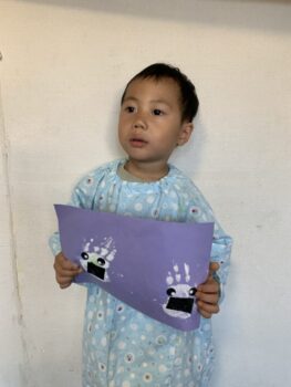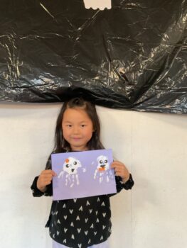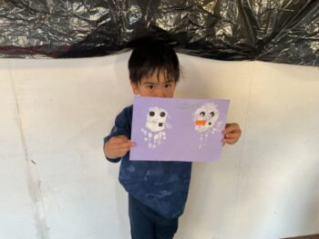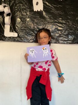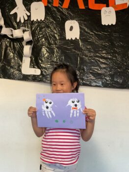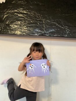 Hello! Today’s lesson was all about Halloween and Opposites. We started our lesson with a spooky song called “Go Away!”. It was a great opportunity to learn about Halloween characters such as Ghosts and Vampires. We then moved on to talking about Opposites such as “Big and Small”, “Hot and cold” and “Fast and Slow”. For our craft today, we made Ghosts Paintings by painting our hands white and putting them on purple paper. It was messy but super fun!