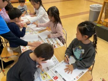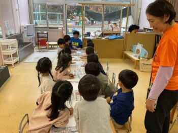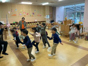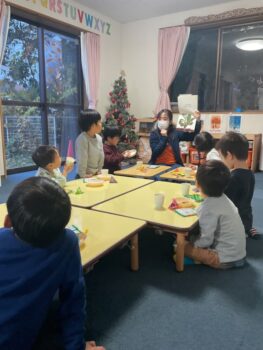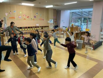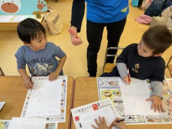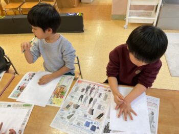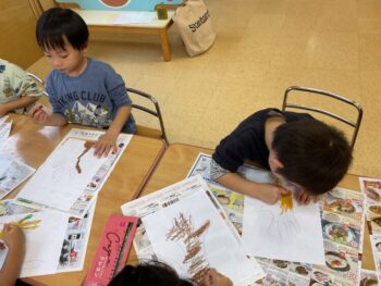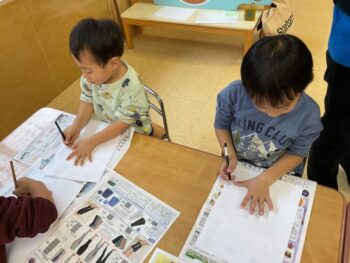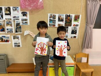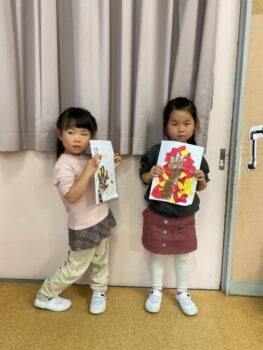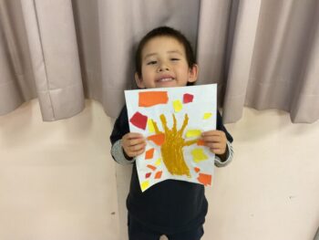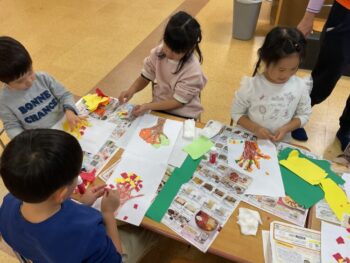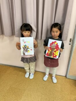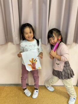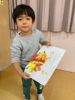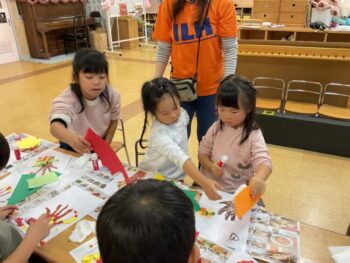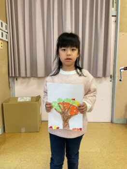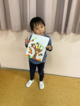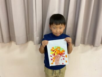 Hello readers! It’s getting colder, isn’t it? Today it was cloudy in the morning and a little rainy in the afternoon. It was a perfect day for the ILH Original song, “Whatever the Weather”! After that, we learned about the parts of the tree. We then started our craft for today, the autumn tree torn paper craft. First the kids traced their hands on paper- this was the trees’ branches. Then they drew on the trunk. Finally, they tore Autumn colored craft paper into leaf shapes and glued them on! Some of the leaves are falling from the tree, and some are on the ground. The kids were great at using their hands! See you next time!