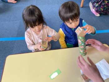 Hello readers! Today, at Kodomo no Mori, we got really jolly and festive! We started out by singing and dancing to “Hello, Reindeer”. We learned words like reindeer, snowman and Santa. We said “Happy holidays!” out loud! After that, we learned how to wrap up some small presents. Tying the ribbon was a little hard, but we tried our best! These mini presents will be perfect for our felt Christmas tree on the wall! What else will we decorate the tree with? Stay tuned!