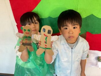 Ho ho ho! Kodomo no Mori’s Christmas Event is coming up soon, but we’re already feeling the holiday spirit! After warming up with Move That Body, we learned about a classic Christmas time treat, gingerbread cookies. Then, we painted our very own cardboard cookies. I think they turned out great! They’re tough, too, so we can decorate the walls with them. From tomorrow, the kids can look for the one they painted! See you soon!