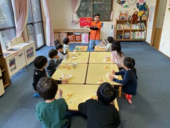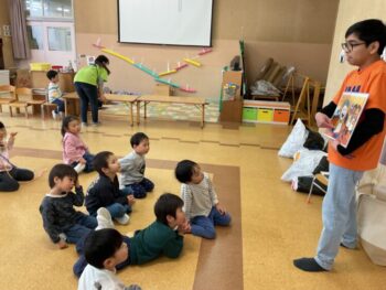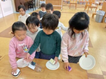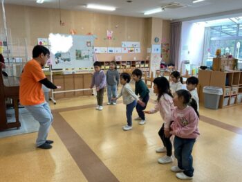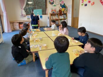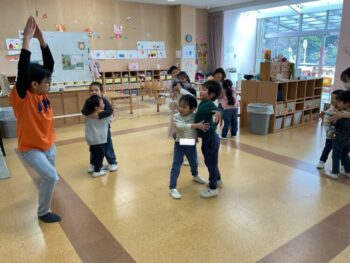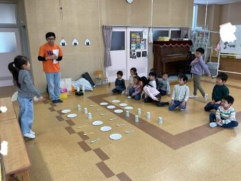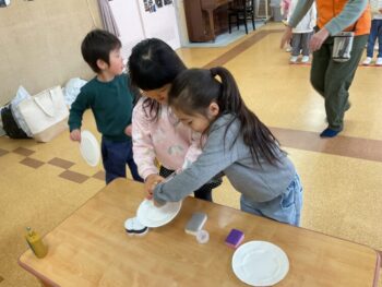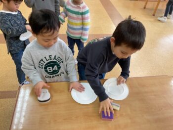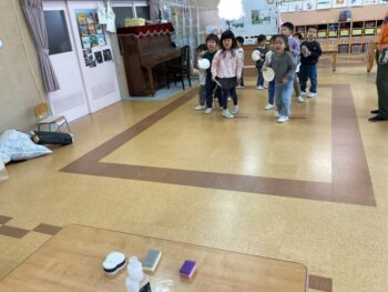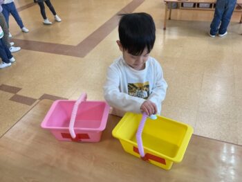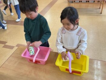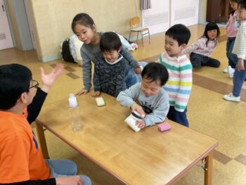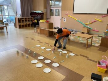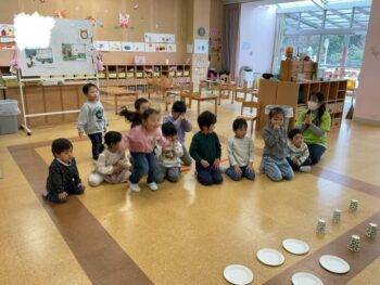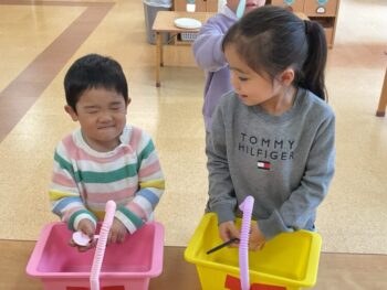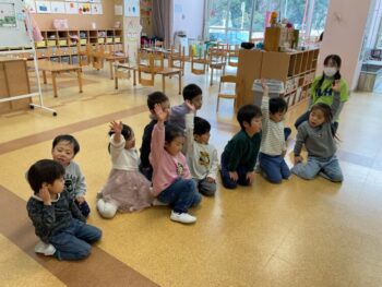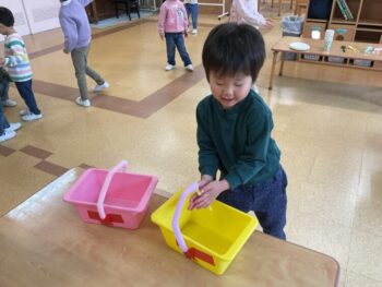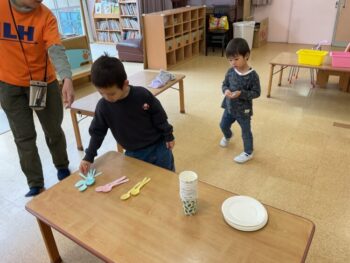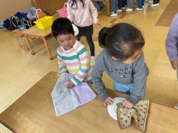 After that we did a quick memory game using today’s kitchen items. We studied the pattern on the floor, and one student took an item. The other kids had to guess which one was missing! We learned sentences like “turn around”, “close your eyes” and “what do you have”. See you next time!
