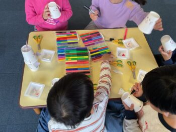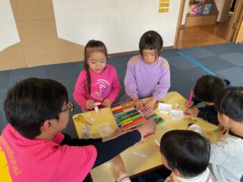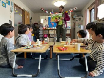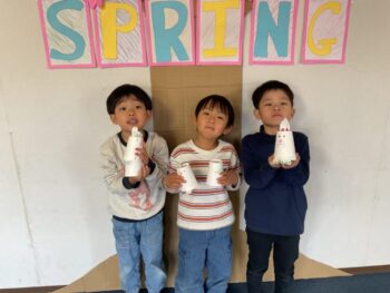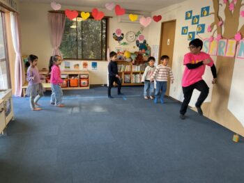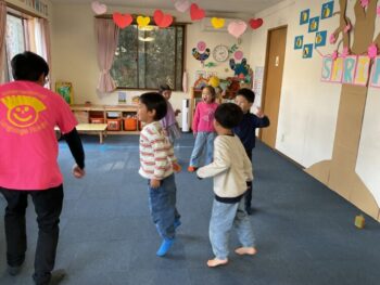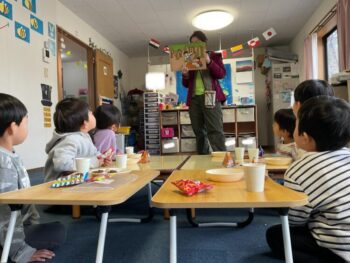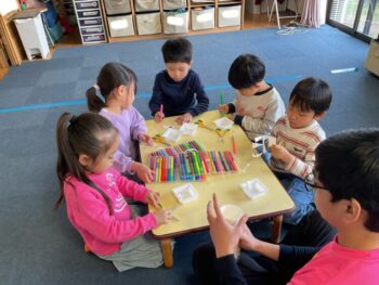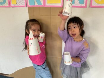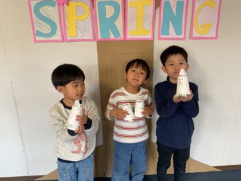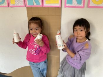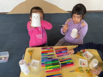 Hello! It’s Joshua! We’re starting the week off with a spring in our step here at Kodomo no Mori! It’s starting to feel like spring little by little, isn’t it? Our theme for circle time today is “jumping and hopping”. First, we did the “Walking walking” song which had a bunch of actions like walk, run, hop and jump. Then we did an animal picture quiz, but using pictures where they’re all jumping. It made the quiz a bit more challenging! Next we moved on to our craft, which is a jumping paper cup rabbit. Using rubber band and a second cup, the rabbit can jump and get some real air time! Finally we did a rabbit relay race outside. While holding balloons between our legs, we hopped like rabbits to the “carrot basket”, took one, and carried it back to our “home stash”. See you next time!