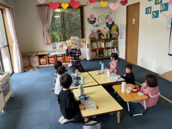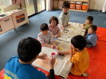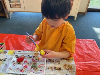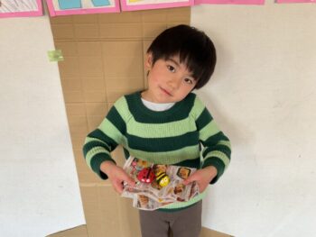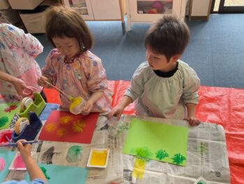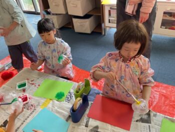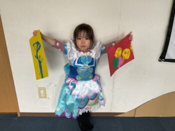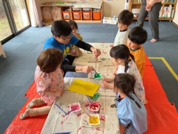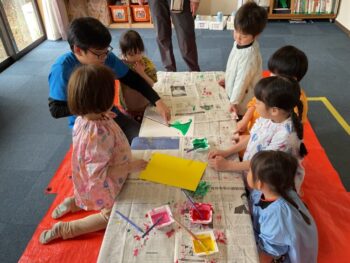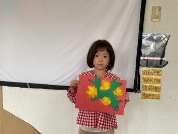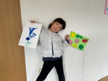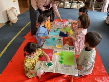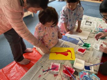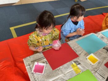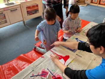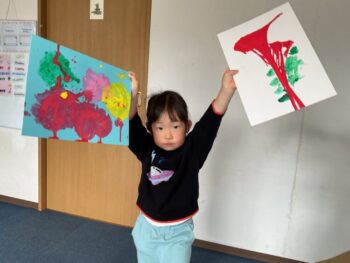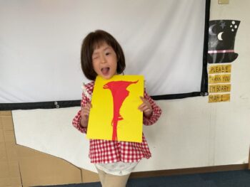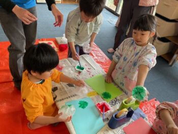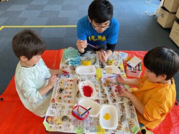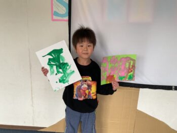 Hello readers, Joshua here! It’s been a while! Today at Spring Camp, we did a mix of our week 1 and week 2 themes, “Brilliant Bugs” and “Colors of the Rainbow”. In the morning, we danced to the ILH Hello Song, which is always a hit! Then we reviewed the names of colors. We looked around the room and talked about the different colors we could find. Then, we did a color stamping craft. First, we inflated and tied up some plastic bags to make a stamp with a unique pattern. The kids used them to paint flowers and fireworks. Then, we took long pieces of yarn, soaked it in paint, placed it on the canvas in a wavy pattern and then pulled it downward. This created a flower-like pattern! It was a bit messy but we had fun.