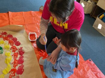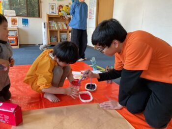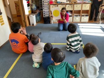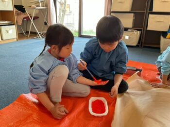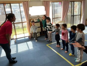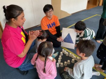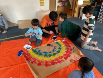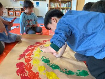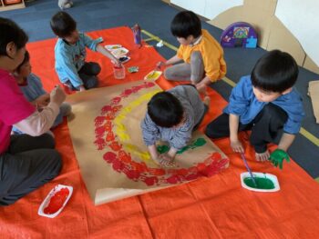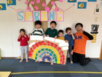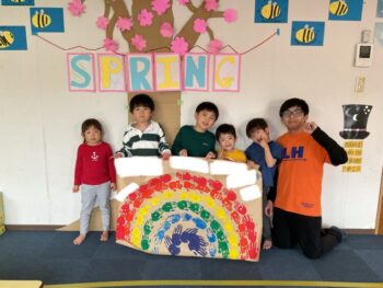 Hello readers! It was another fun-filled day at Spring Camp! In the morning, we had a guest teacher, Sadiya-sensei. We learned about colors, shapes and cars with her! In the afternoon, we danced to an ILH Original song, “The Pharaoh’s Dance”. We did hieroglyph poses, tricky hand movements, and mummy gestures! We then moved on to our craft. True to this week’s theme, we took a look at the colors of the rainbow and then painted one with our hands! Each kid did one color, and I joined in on the fun, too. The rainbow turned out great and Kodomo no Mori’s wall is now decorated with it! See you next time!