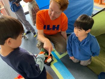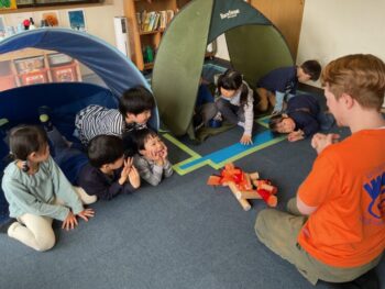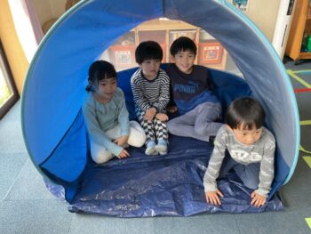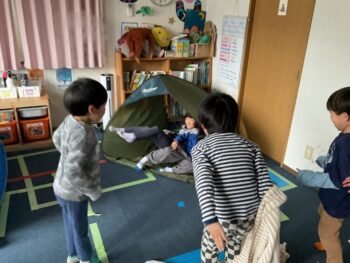 Good afternoon! Welcome to our third week of Spring Camp, where we are talking about everything related to camping and the outdoors. We started our day with some stretches and then danced to the “Freeze Dance”. For our first circle time today, we learned about “Camping” and learned some new words such as “Sleeping Bag”, “Tent” and “Frying Pan”. For our first activity, we played two games involving camping called “Campfire Cook-off” and “Whose still Sleeping?”