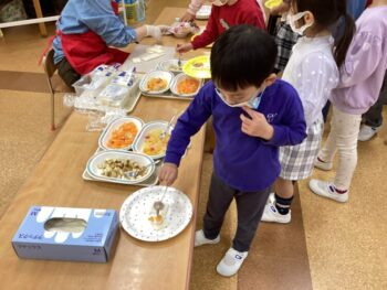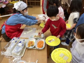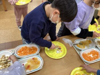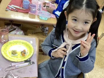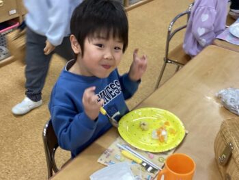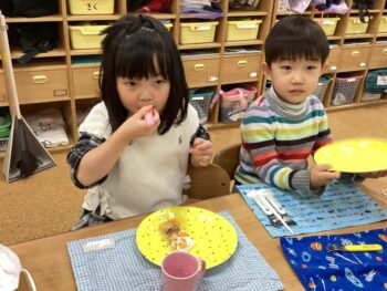 ささやかですが、学期の終わりに1年間頑張ったね&クリスマス会楽しもうね!パーティーをしました。 ランチの後に、食パンにホイップクリーム、果物を乗せたケーキをいただきました。 沢山クリームや果物を乗せる食いしん坊な子どもたちでした♪ 楽しいことが盛りだくさんの2学期。また3学期も楽しいことを沢山しましょう!